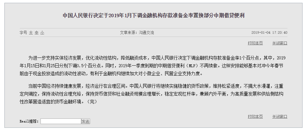 当天下午,央行就发了降准公告,宣布于2019年1月下调金融机构存款准备金率置换部分中期借贷便利。
